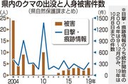 県内ではこれまで2004、06、10年にツキノワグマが大量出没しました。今年の目撃・痕跡情報は8月までは平年並みでしたが、9月は114件と、06、10年に次いで3番目に多くなりました。10月も1日10件超のハイペースで出没しています。