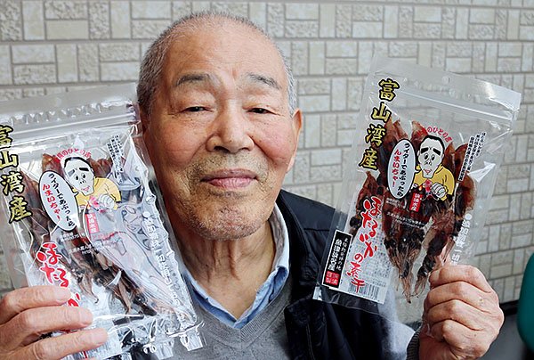 決めぜりふは「ライターであぶったら んまいちゃ!」。なんとも味のある、おっちゃんのイラスト入りパッケージがずっと気になっていた。浜浦水産(魚津市上口)の看板商品「ほたるいかの素干(すぼし)」。おっちゃんは実在するのか。会えるものなら会ってみたい。勇気を出して浜浦水産を訪ねた。(「んまい」は魚津弁で「おいしい」です)
