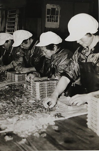 ホタルイカを加工する女性たち=昭和50年代、魚津市上口
