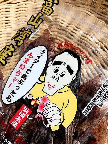 昭夫さんは味に自信があった。塩加減や乾燥方法など試行錯誤を重ね、内臓もまるごとそのまま使い、ホタルイカ独特のうまみを感じる素干しになった。「食べてもらえば分かるのに…」。悔しかった。ライターでさっと温めると内臓のうまみが増して、香ばしい。「ライターであぶったら、んまいがやちゃ」。愛情が詰まった社長のつぶやきだった。それをそのままイラストにしてパッケージに描いたら目を引きそう―。とんとんと話が進んだ。「ま、遊び心やね」と昭夫さんは振り返る。