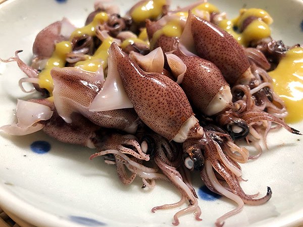 富山湾のホタルイカは身が大きく、内臓が詰まって、ゆでるとむっちりぷっくりして、格別おいしいです。中でも、「4月のホタルイカは一番おいしい」と昭夫さんが教えてくれました。ちなみに、素干しは数匹つまみ食いするならライターで十分ですが、たくさん食べる時はフライパンで軽く空いりするのがお勧めとのこと。地酒を用意して、今度やってみようっと。