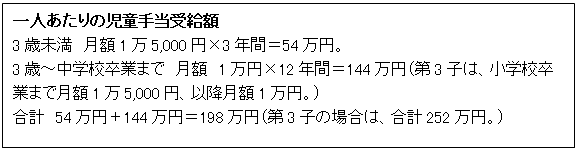 児童手当を受給する15年間、第一子、第二子の場合、すべて貯めるだけで約200万円となります。それに頂いたお祝い金やお年玉などを一緒に貯めていくと、総額300万円は準備できるのではないでしょうか。児童手当は、子どものお金として生活費とは切り離してしっかりと確実に貯めていきましょう。