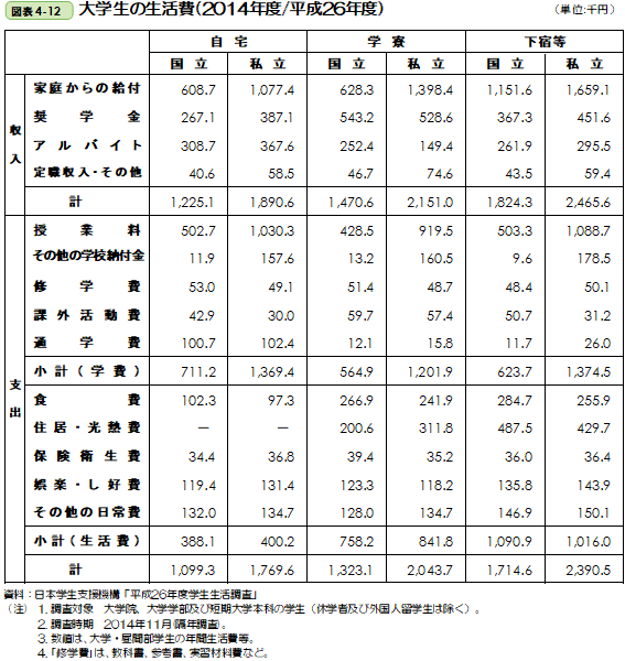 やはり一番お金がかかるのは、大学に通う4年間でしょう。なんとなくわかってはいるけど、実際いくらかかるのか。授業料を含んだ大学生の1年間の生活費を見てみましょう。