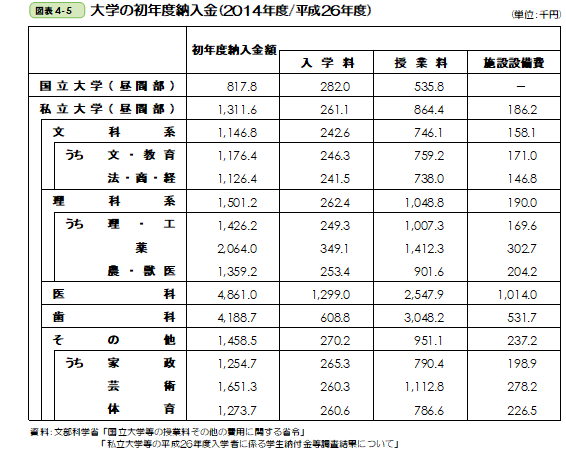 また、私立でも文科系か理科系かで、授業料等は1.4倍から4倍違ってきます。