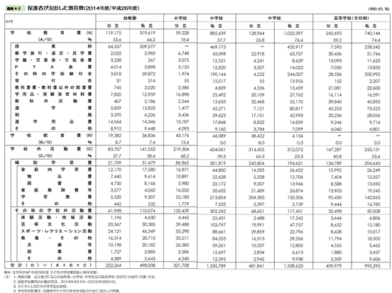 子ども一人あたりの1年間での学習費の支出平均額(給食費をはじめとした学校へ払う費用と、塾など学校外活動費を含めたもの)を見ると、