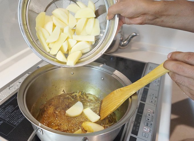 4)じゃがいもを加えて混ぜ、ふたをして中火で3分おきます。