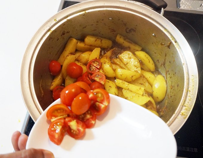 1)じゃがいもは皮をむき一口大のくし形、玉ねぎは薄切り、ミニトマトは4等分に切ります。