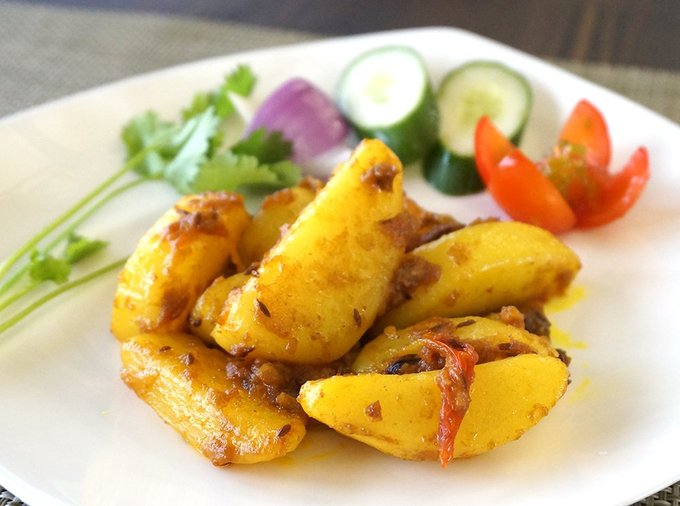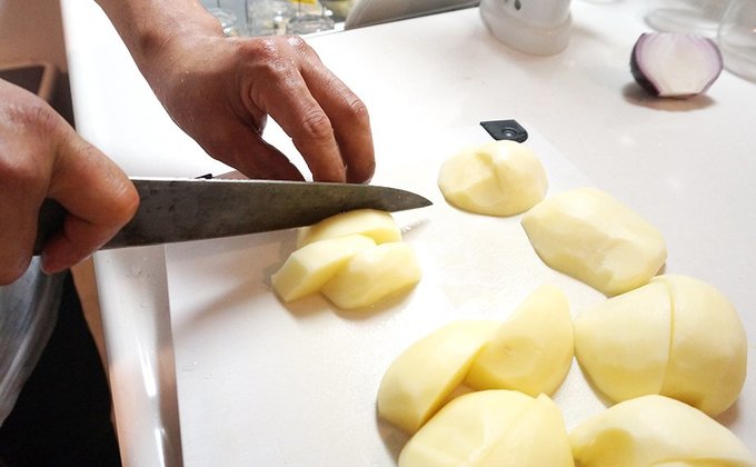 ネパール出身の曼荼羅(まんだら)絵師ダルマ・ラマさんに「アル・ブテコ」というネパール料理を教えてもらいました。アルはじゃがいも、ブテコは炒め物という意味です。1日2食のネパールで3時のおやつとして、またホームパーティーの一品としても出される人気のメニューです。