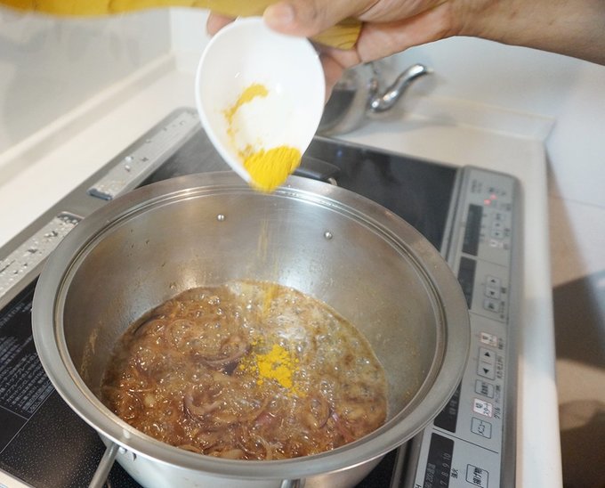 3)玉ねぎがしんなりしたら、ターメリックを入れて混ぜます。