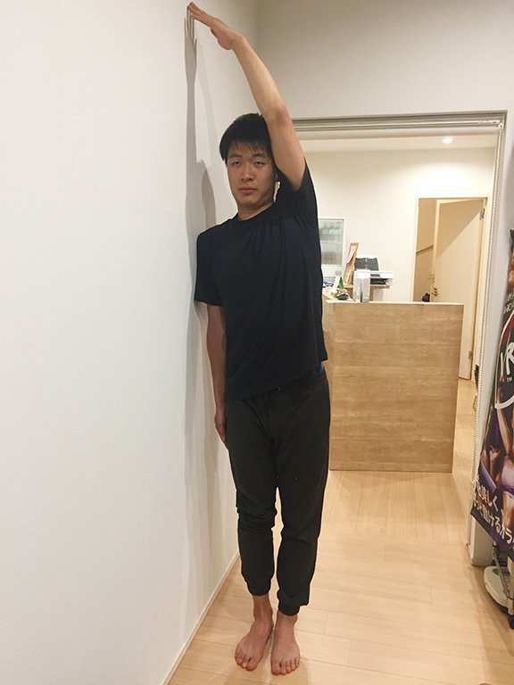 壁に肩をつけるように横向きに立ち、遠い方の手を上げて壁につけます。足はくっつけたまま、体の外側が伸びるイメージで30秒×2セット。これを左右両方行います。