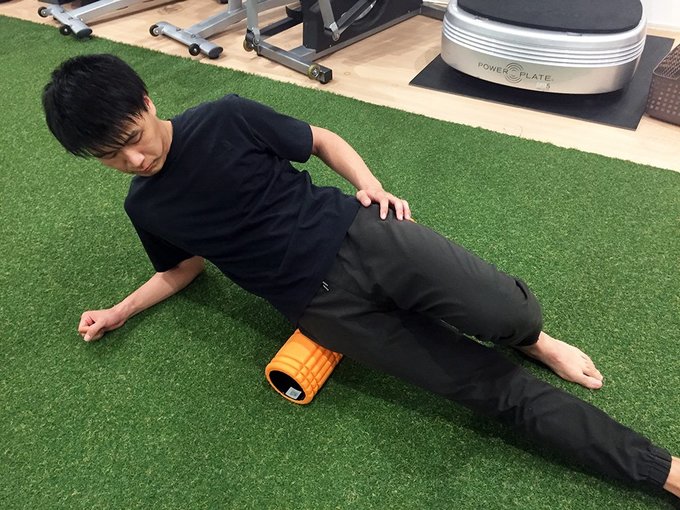 横を向いた体勢で、ローラーの上にお尻を乗せ、前後の移動を左右繰り返します。腰まわりの筋膜を柔らかくすることで、腰痛の改善につながります。