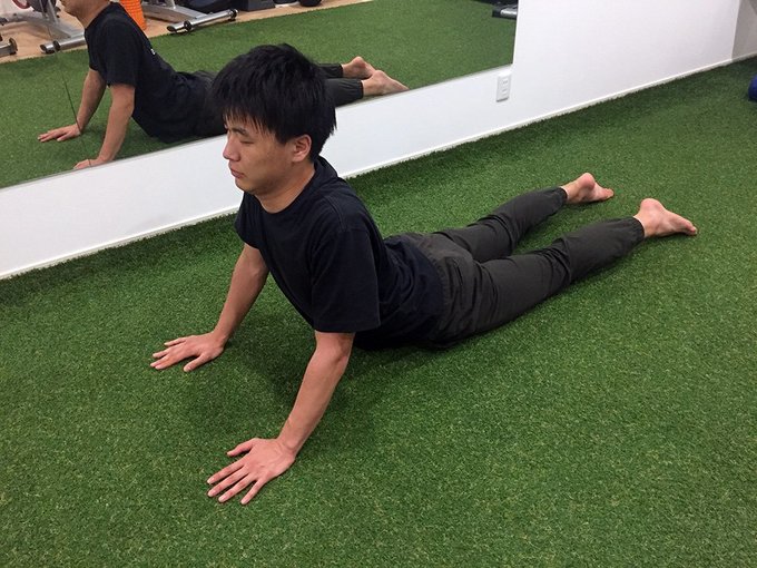 オットセイのようなポーズをとり、痛くない程度に上半身を起こし、あごを引いた状態で30秒×2セット。この時、お腹から上は頭の方向へ、お腹から下は足の方向へ、体を伸ばすイメージを持ちます。