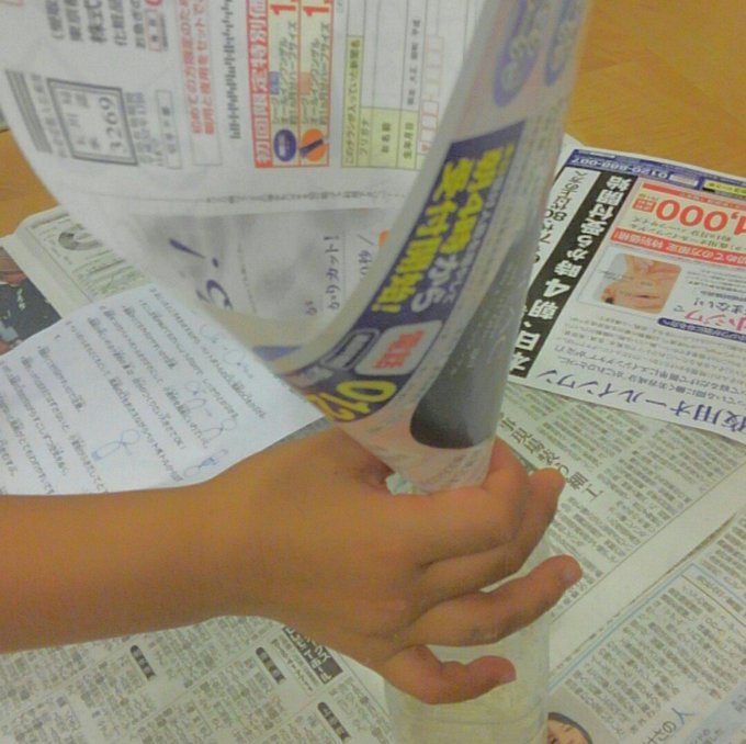 ペットボトルの口に新聞やチラシを写真のように差し込むと、入れやすいです。