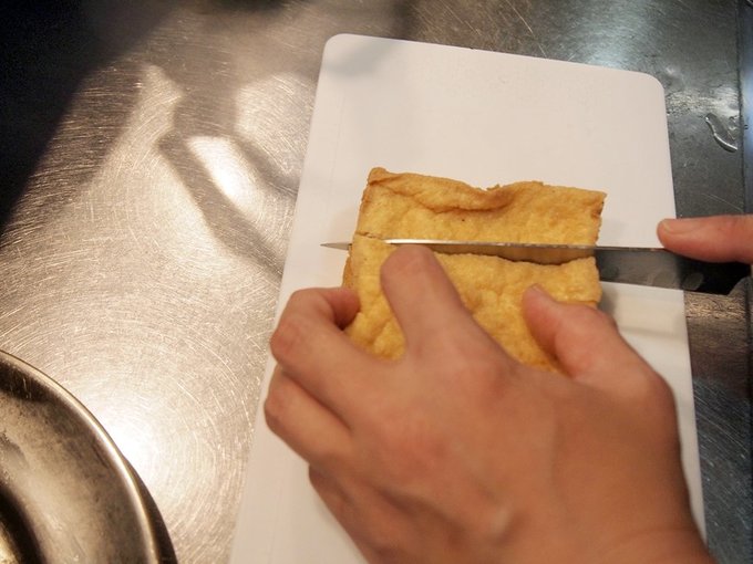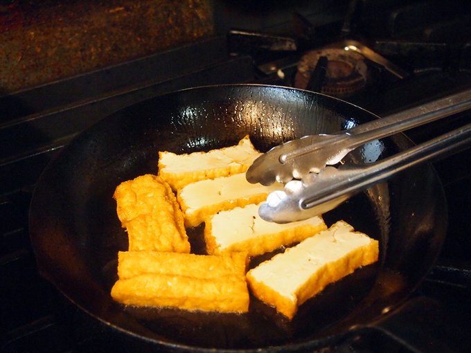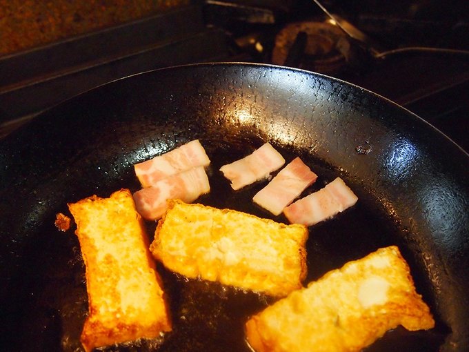 3.フライパンに少し多めに油を敷き、温まったら厚揚げを入れてこんがり焼き色がつくまで、両面をひっくり返しながら焼きます。この時に、フライパンの空いたスペースでベーコンもお好みの焼き加減で火を通します。