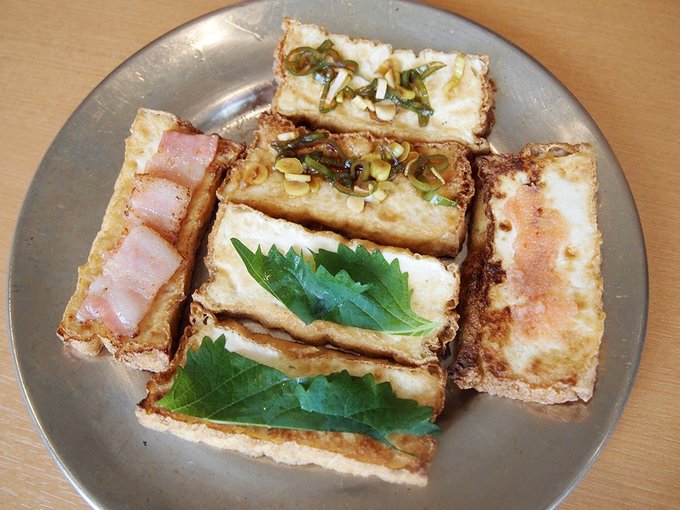 4.焼きあげた厚揚げの上に、ネギ醤油(できるだけネギだけ)、大葉、明太子、ベーコンを全体的に乗せていきます。