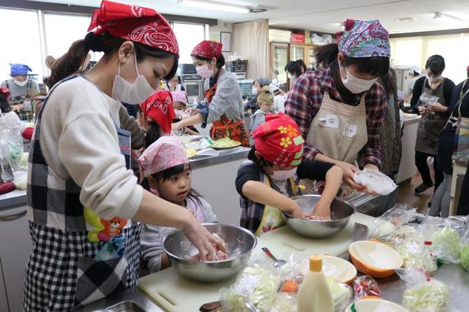 ヨシケイライフスタイル(同市)が昨年に続いて開催。エプロン姿の親子は同校の瀬尾和子学校長に教わり、「クリスマスリース風ミートローフ」と「野菜スープ」の2品を料理した。 親子は協力して肉をこね、食材を切っていった。カットされた野菜を使ったり、レンジで加熱したりして〝時短〟調理に取り組んだ。ロールケーキをデコレーションした「ブッシュ・ド・ノエル」も作った。