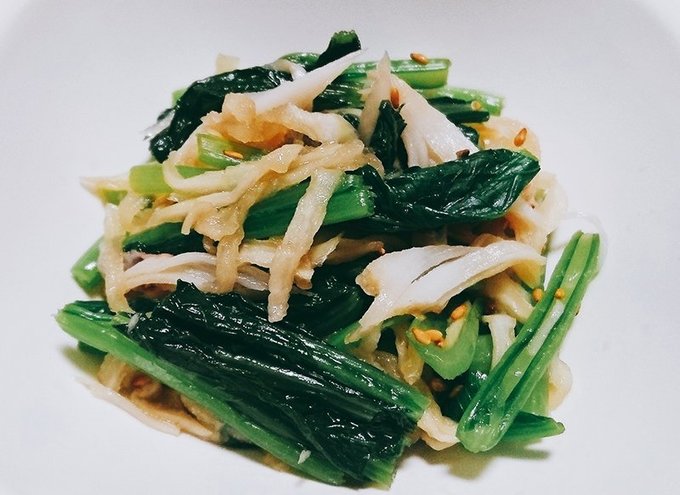 小松菜には脂溶性のビタミンであるビタミンAが多く含まれており、ごま油と一緒に調理することにより、吸収がよくなります。体の老化を防ぐ抗酸化ビタミン、ビタミンA、ビタミンCも摂取することができます。