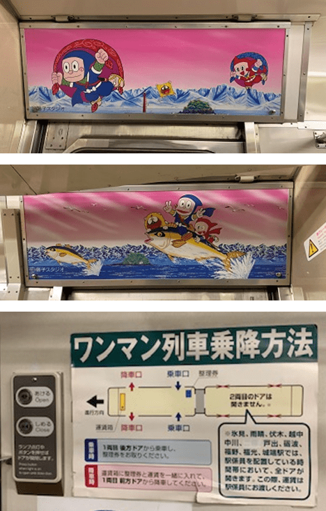 忍者ハットリ君列車 2019年5月29日 12:04 老子さん コノコトレポーター 先日、伏木けんか山祭に行く時に、氷見線を利用しました。何年ぶりでしたでしょうか。 行き帰り、たまたま、忍者ハットリ君列車に乗ることが出来ました。走っている電車を見かけることはあっても、乗る事は無かったので、孫と2人、興味津々で、車内を見て回りました。 ワンマン列車に乗ることもない孫に、乗り方を教えてあげられて、良かったかな!? この機能は会員限定です。 お気に入りの記事を保存し、マイページで読むことができます。 ログイン 会員登録はこちら