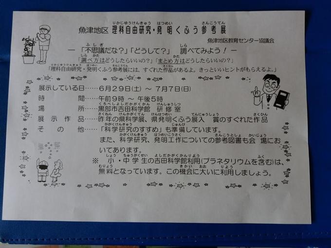 夏休みの宿題準備 2019年7月9日 22:54 濱田さん コノコトレポーター いよいよ、7月。夏休みも直ぐそばまで来ています。 吉田科学館で、魚津地区 理科自由研究・発明くふう参考展に行きました。昨年の優秀作品、参考図書の紹介、まとめ方のしおり展示されていました。 毎年ここへ来て、子供とやりたいことを話し合います。早く取りかかるわりには、夏休み最後まで片付かない宿題。今年こそは、早く宿題を終わらせて、小学最後の夏休み楽しめると良いなと願いながら、帰宅しました。 この機能は会員限定です。 お気に入りの記事を保存し、マイページで読むことができます。 ログイン 会員登録はこちら