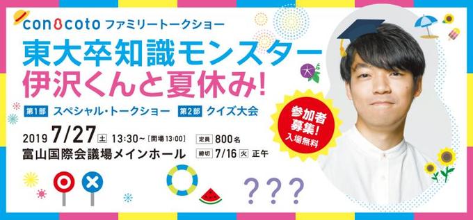 人気クイズ番組や自ら立ち上げたYouTubeチャンネル「QuizKnock」でクイズの楽しさを発信する東大卒知識モンスター、伊沢拓司さんをお招きし、コノコト会員の親子を対象にトークショーとクイズ大会を開催します。小中学生の頃の夏休みの過ごし方やおすすめ勉強法は?幅広いことに関心を持つことが大事という伊沢さんのトークやクイズ解説に期待です。ぜひご家族でお楽しみください。