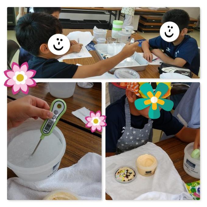 次にアイスクリーム作り。先に学んだ氷の性質を使い、振るやら転がすやら、大はしゃぎ。蓋を取ると、とろ~んとしたアイスクリームが出来上がり、子供たちは目を輝かせ笑顔いっぱいでした。