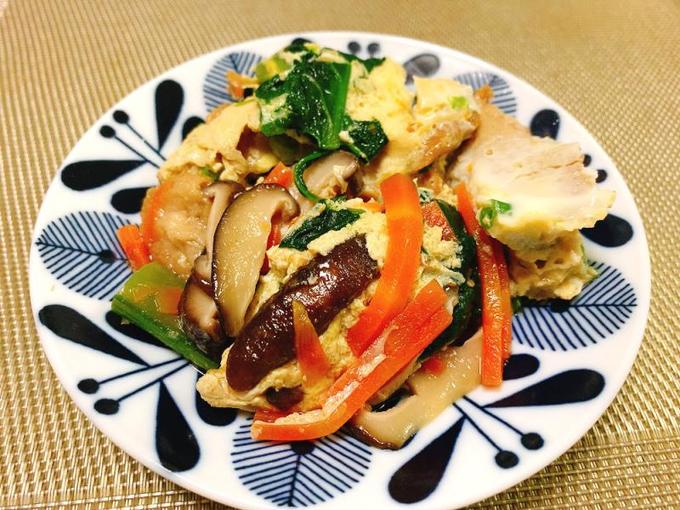 - 鍋に水、調味料を入れ、ニンジンを入れて柔らかくなったら、しいたけ、スナップエンドウ、油麩(ふ)を入れて煮立てます。ほうれん草を入れ、しばらく煮たら、溶いた卵を入れ、ふたをし、2~3分煮ます。