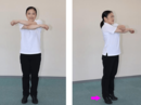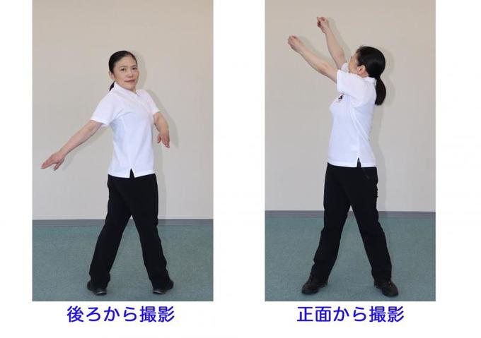 左足を横に開き、腕を横に振ります。息を吸いながら胸を斜め上に上げ、胸を反らしたら、息を吐きながら腕を振り下ろします。この時、手のひらが後ろを向くぐらい腕全体をねじってください。胸から腕、手のひらまで、1本の棒を絞り込むような感じです。