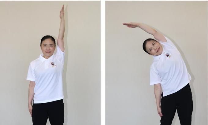 右腕を上げ、体を横に曲げる動きを2回繰り替えします。反対側も同様に動かしてください。以上の動きを2回行ってください。前かがみにならないように、腕は真横から上げましょう。わきの下の筋肉は普段の生活ではあまり使わない「おさぼり」の筋肉。しっかりと伸ばしましょう。