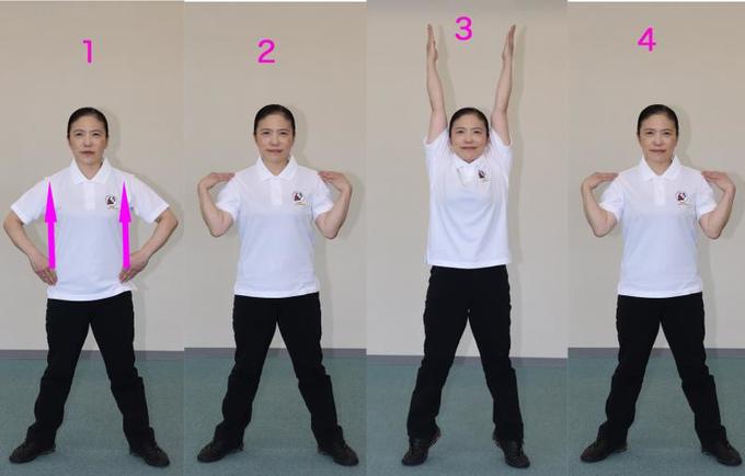 左足を横に開き、指先を腰から肩に素早く上げて脇を縮めます(1、2)。続いて腕を素早く上に伸ばすと同時にかかとも上げます(3)。左足を戻しながら腕を肩、腰と戻します。反対側も同様に動かします。以上の動きを2回繰り返してください。号令をかけながらきびきびと動かせば、より力強く素早い動作で行うことができます。