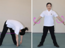 以上の動きを2回繰り返します。前屈では、首や肩の力を抜き、上半身の重みで弾みをつけましょう。