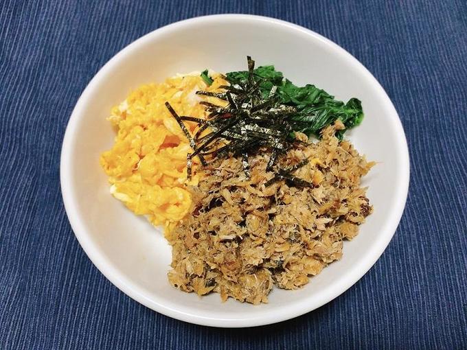 それらを踏まえ今回は、手軽に使える青魚の食材、サバの缶詰を使います。サバフレークで作る三食丼です。