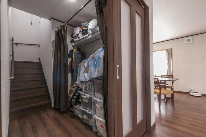 末娘が4月に小学生になり、手が離れてきたとはいえ、4人の子どもの衣類やおもちゃ、本などによって室内は煩雑になりがち。その場で必要なものはそこで整理整頓できるよう、大容量のクロークやパントリーなど適所に収納スペースを設けた。印象的なのが、浴室近くの階段下デッドスペースにレイアウトした階段前室。網型のパーティションや透明な衣装ケースが置かれ、中に何が入っているかすぐに分かる。家事時間の短縮にもつながっているようだ。