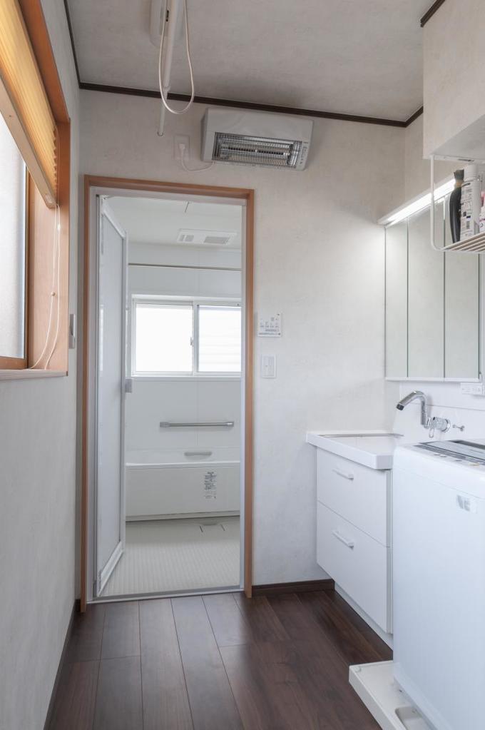 子どもの着替えによって洗濯物も多い。浴室手前の洗面脱衣室には、洗濯機や昇降式の物干し竿を設置し、効率よく家事できるように工夫した。ヒートショックを防ぐため、脱衣室の上部にヒーターを設けたが、洗濯物の乾燥にも役立っている。
