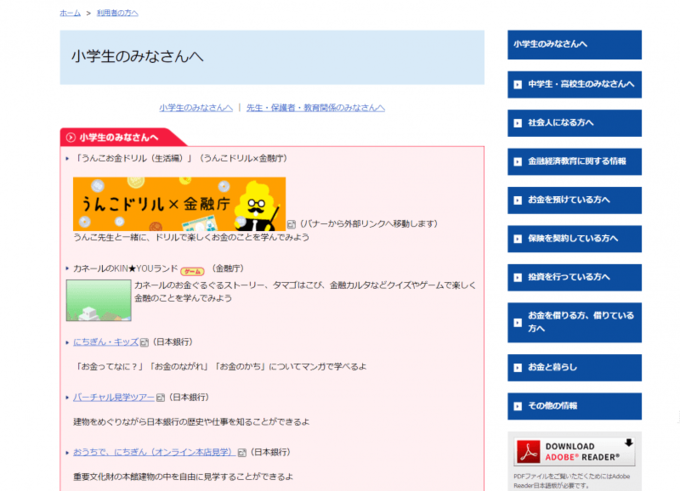 最初にご紹介するのは、金融庁のサイトです。小学生向け、中学生・高校生向けに分けて、おすすめのサイトをまとめています。