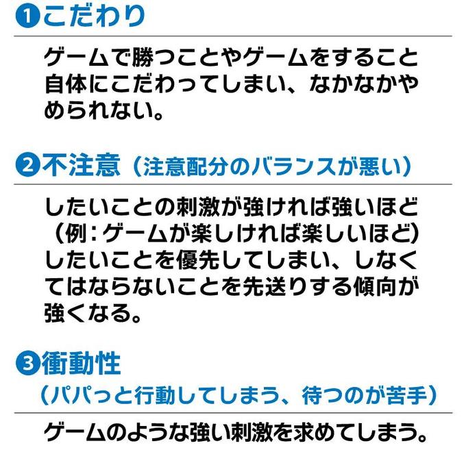 子どもさんが持っている特徴が原因で、ゲームから離れにくくなるケースがあります。それが神経発達症、いわゆる発達障害の特徴にある以下の3つです。