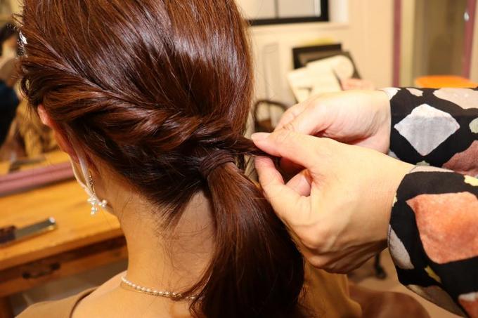 上級編は、エレガントなスタイルを提案します。「左右対称な髪型より、非対称の方がおしゃれに見えますよ」と幸田さん。頭の片側にアレンジを加えます。