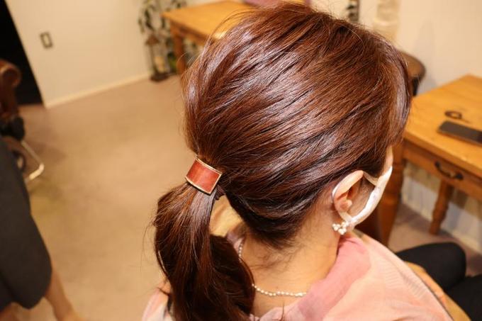 こめかみ部分の髪を引っ張るようにして縛ると顔がリフトアップされ、引き締まって見えます。 。