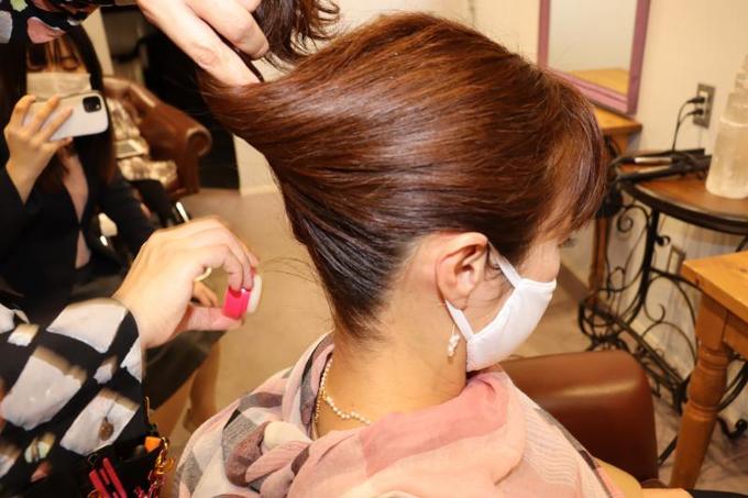 ⑨ハードタイプのヘアスプレーを髪から15cmほど離し、下から上の方向にかける。
