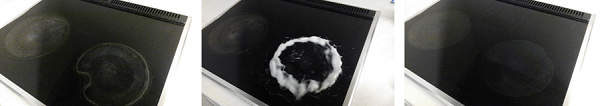 クッキングヒーターは調理の後、必ず水拭きはしていましたが、いつのまにかできたおこげリングを放置していました。重曹を水でクリームクレンザーくらいの固さにして汚れの上に乗せ、30分くらい置いてからアルミホイルをくしゃくしゃにしたもので磨きました。アルミホイルがいいと、どこかで見たので使ってみました。傷のように見えていたのは全て汚れだったみたいで、磨いた後はピカピカになりました。