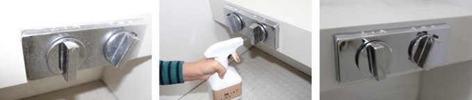 水あかのついてカランにクエン酸水をスプレーし、スポンジで磨き、最後にから拭きしました。ピカピカになると、お風呂全体がキレイになった感じがします!