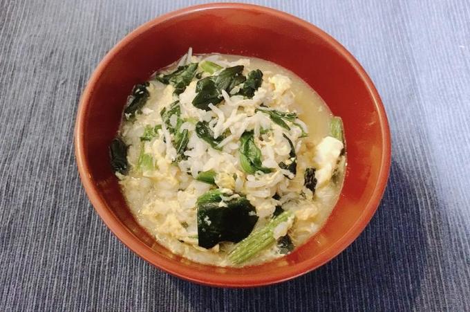 - 鍋にめんつゆと水を入れ、中火にかけます。ごはんを入れて、ほぐしながら煮ます。ごはんが汁を吸ってきたら、ホウレンソウとシラス、卵を加えます。