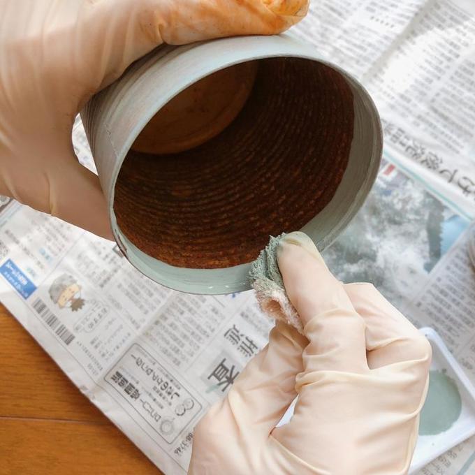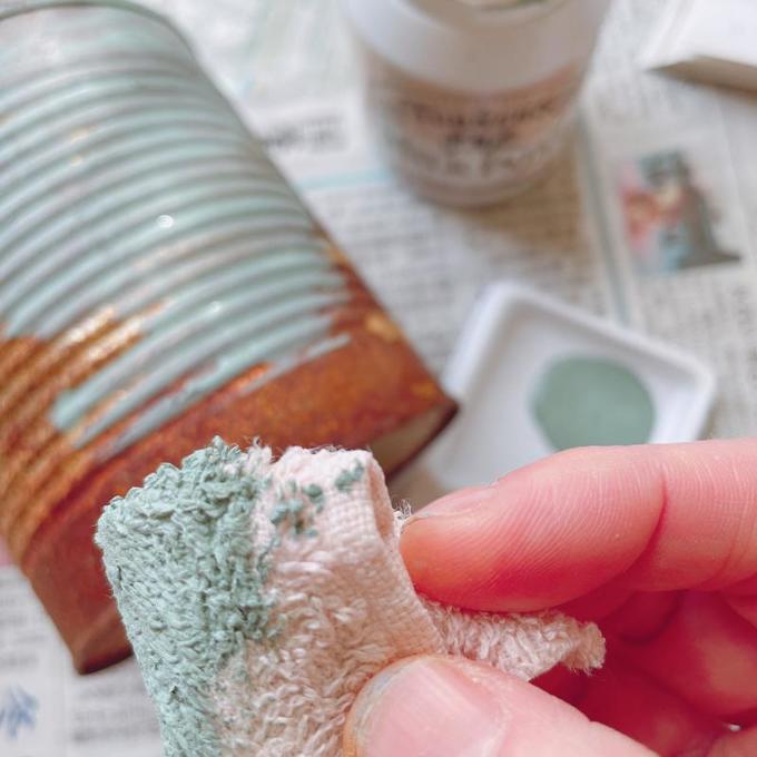 ②使い古したタオルに水性アクリル塗料を含ませ、缶に塗ります。