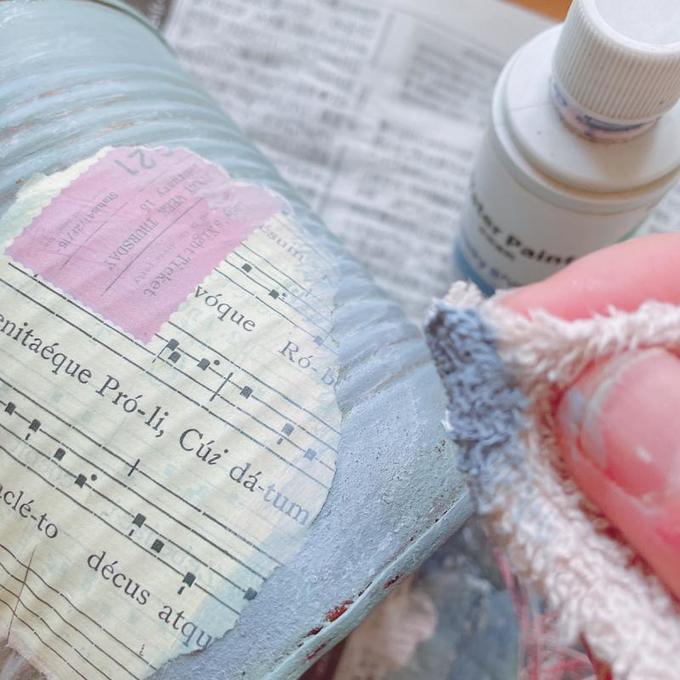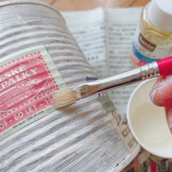 ⑤お好みで、紙ラベルの端に塗料をポンポンと叩くようにつけ、おしゃれに見せます。