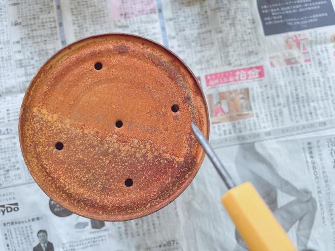 ①作業スペースに新聞紙を敷き、缶の底に、きりを使って5〜6か所、穴を開けます。