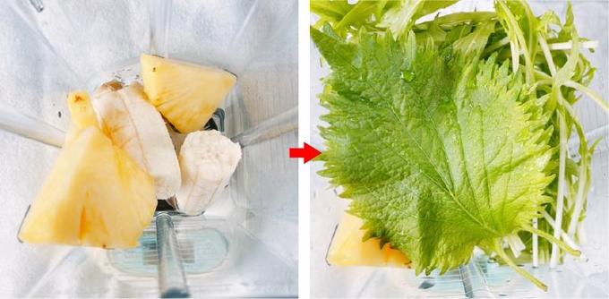 今回は大葉に含まれるロズマリン酸、水菜やパイナップルに含まれるビタミンⅭ、緑茶に含まれるカテキン、バナナに含まれる白血球の働きを増強させる成分が相まって、免疫力アップが期待できるレシピです。