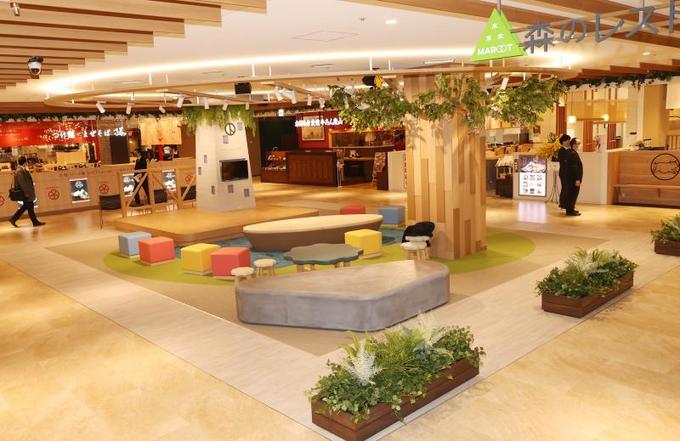 4階は、中央に高原の森と池をモチーフにしたフリースペースがあり、書店やレストランが並びます。