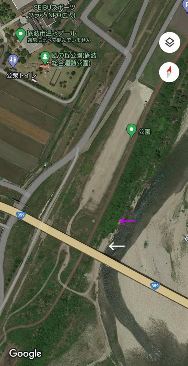 なので、イマドキらしい、整備された場所での水遊びをしようと砺波に住む友人を誘ったところ「うちの子は怖がってるんだけど、川遊びができるいいスポットを教えてもらったので試しに行ってみない?」と逆お誘いが。 庄川の河川敷で地元の方は結構知っておられるスポットだということでした。 場所はここ↓(白い←は車 ピンクの←遊んだ場所)