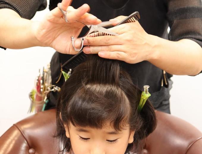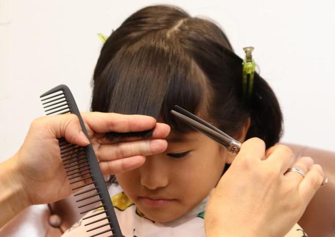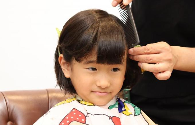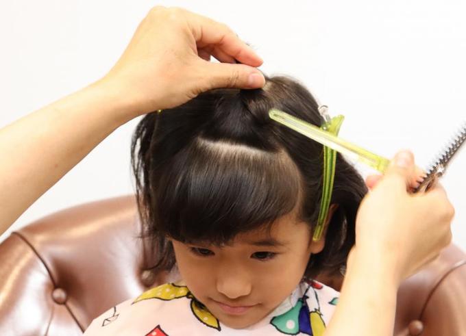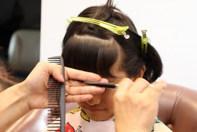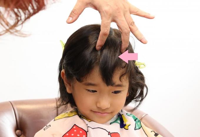 大人と違って、子どもは髪の分け目がしっかりしていないため、前髪とサイドの区別がつきにくい(全ての髪が前に下りてきてしまう)のが難しいところ。