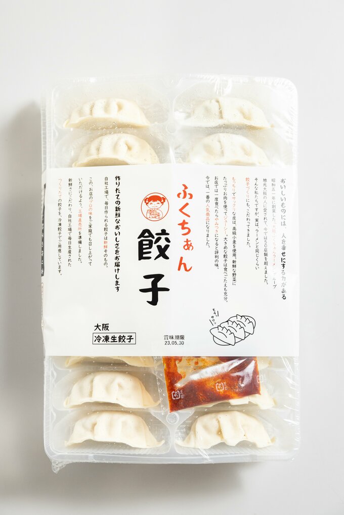 大阪ではおなじみの「大阪ふくちぁんラーメン」の人気ナンバーワンサイドメニュー、オリジナルギョーザをいつでも味わえる。県内では2022年4月に1店舗目がオープンし、現在は18店まで増えた。豚肉やニンニク、ニラ、白菜など食材は国産100%にこだわり、生のギョーザをそのまま冷凍し鮮度を保った。1個23㌘と大粒で食べ応えも十分だ。