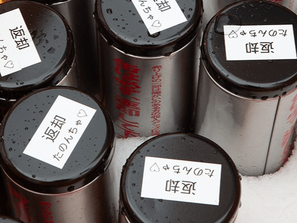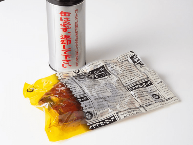 缶は自販機の横の箱に要返却。「返却たのんちゃ♡」とユーモアたっぷりのシールが貼られている